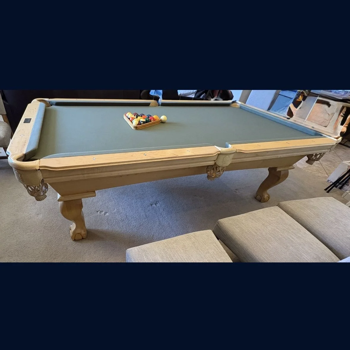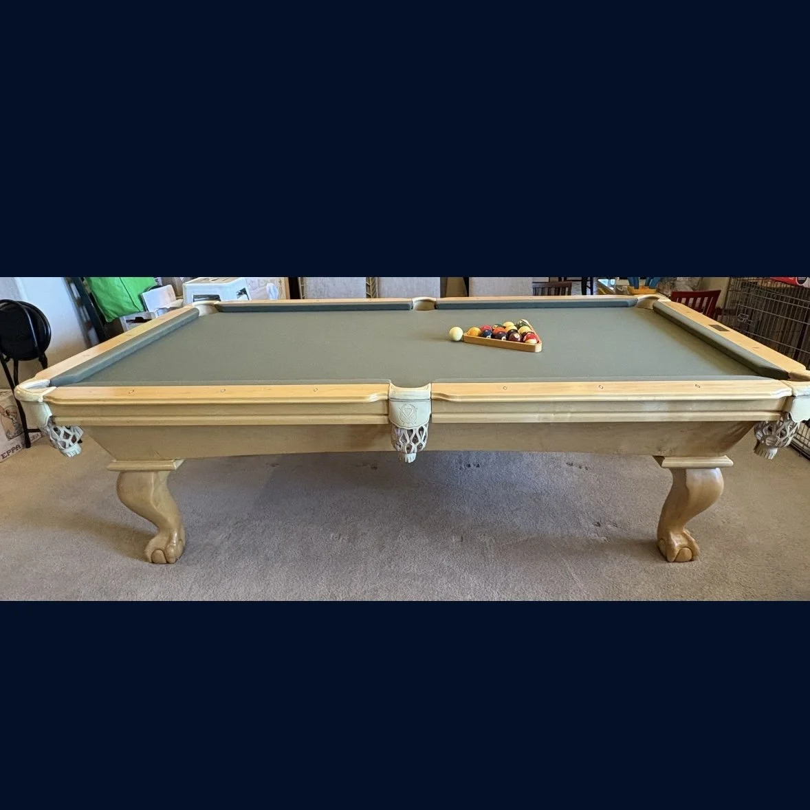 An antique 8’ Golden West pool table made in the USA! Beautiful ornate design in a massive footprint! Naturally weathered but still plays like new! Bumpers were replaced this year! Buyer can choose any color felt free. All accessories included. Delivery and install available.